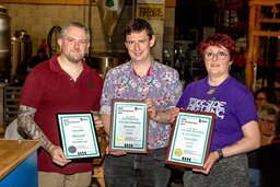 His London porter, brewed at Torrside under the name Beowulf, took silver in the Beer of the Festival competition at Chorlton Beer Festival, while the imperial version, Grendel, went one better at Stockport, picking up the overall Beer of the Festival. Jon is seen here (photo right) along with Torrside’s Chris Clough and Sarah Rothko-Wright, with a trio of certificates. Jon tells us that Torrside are rebrewing both Beowulf and Grendel for the winter season, so if you’ve not yet tried them, you’ll get a second chance.