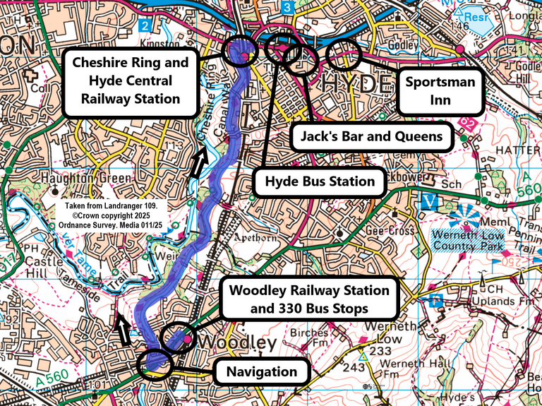 A pub walk can be the perfect pick-me-up during the winter months, despite the damp and cold. A gentle stroll through nature can be revitalising, not just for the body but also the mind, whether taking some time out for yourself, or with the good conversation of a friend. We can then add the prospect of a welcoming pub serving fine cask beer, and perhaps warm ourselves next to a real fire. A pub features at the start of this walk, in Woodley, with a choice of four at the finish in Hyde. As with all our pub walks, it is designed to be used with the excellent public transport options in our area.