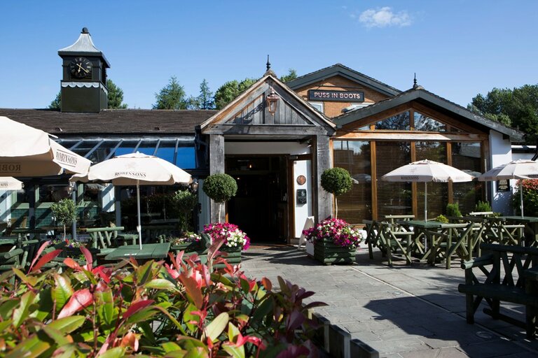 The Puss in Boots is a 1970s estate pub which had been run down throughout the 2000s before being temporarily closed. The Almond Family pubs group took over the tenancy of this Robinsons pub and, following a refurbishment in 2010, it was reopened. There have been some further additions and improvements since.